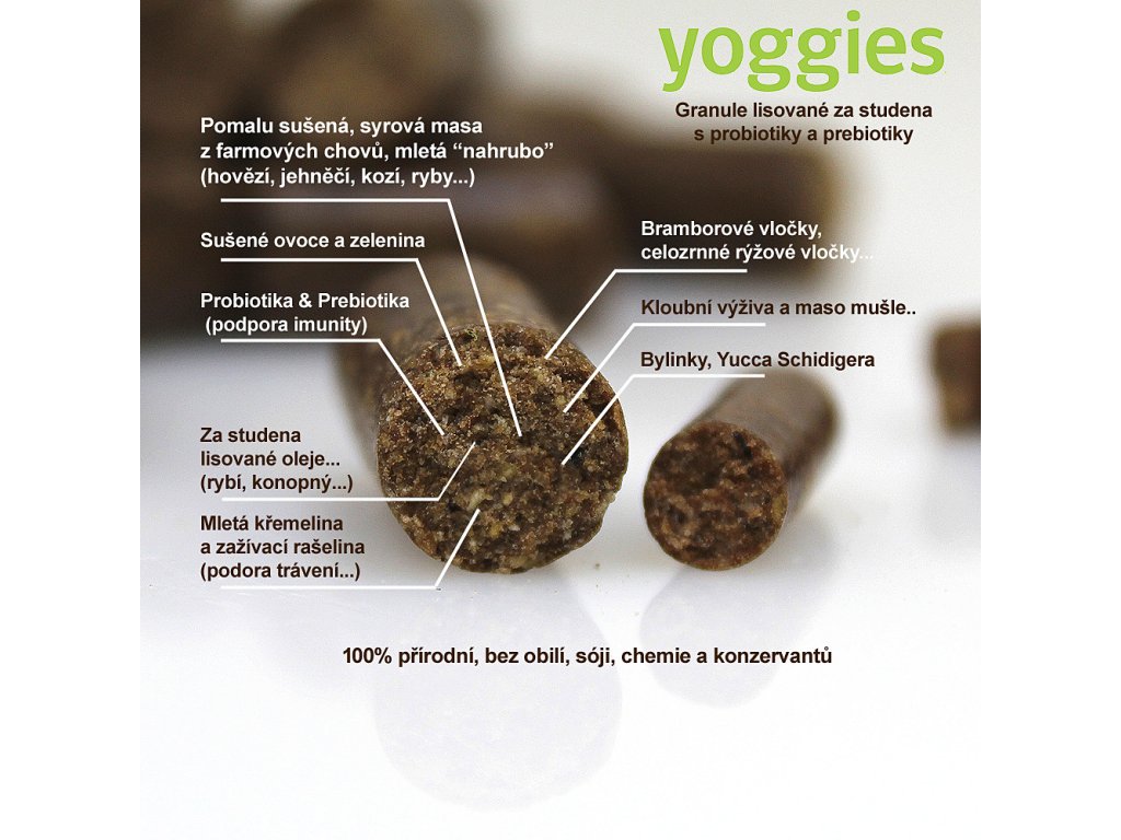 Yoggies granule lisované za studena sú svojou chuťou aj vôňou bližšie k prírode. Už z výroby si zachovávajú prirodzenú chuť, vôňu a výživové hodnoty vďaka lisovaniu za studena (do 38 ° C). Suroviny sú starostlivo vyberané, sušené, mleté a potom len lisované do tvaru granúl. Yoggies granule majú prirodzené výživové zloženie získané zo surovín použitých na výrobu. Obsahujú mäso, ovocie, bylinky, látky prospešné pre vývoj aj vitalitu psa a tiež prímes živých laktobacilov. Tie sa v tele psa postarajú o podporu črevnej mikroflóry, posilnenie imunity a budúce dobré zdravie psa a spokojnosť chovateľa.