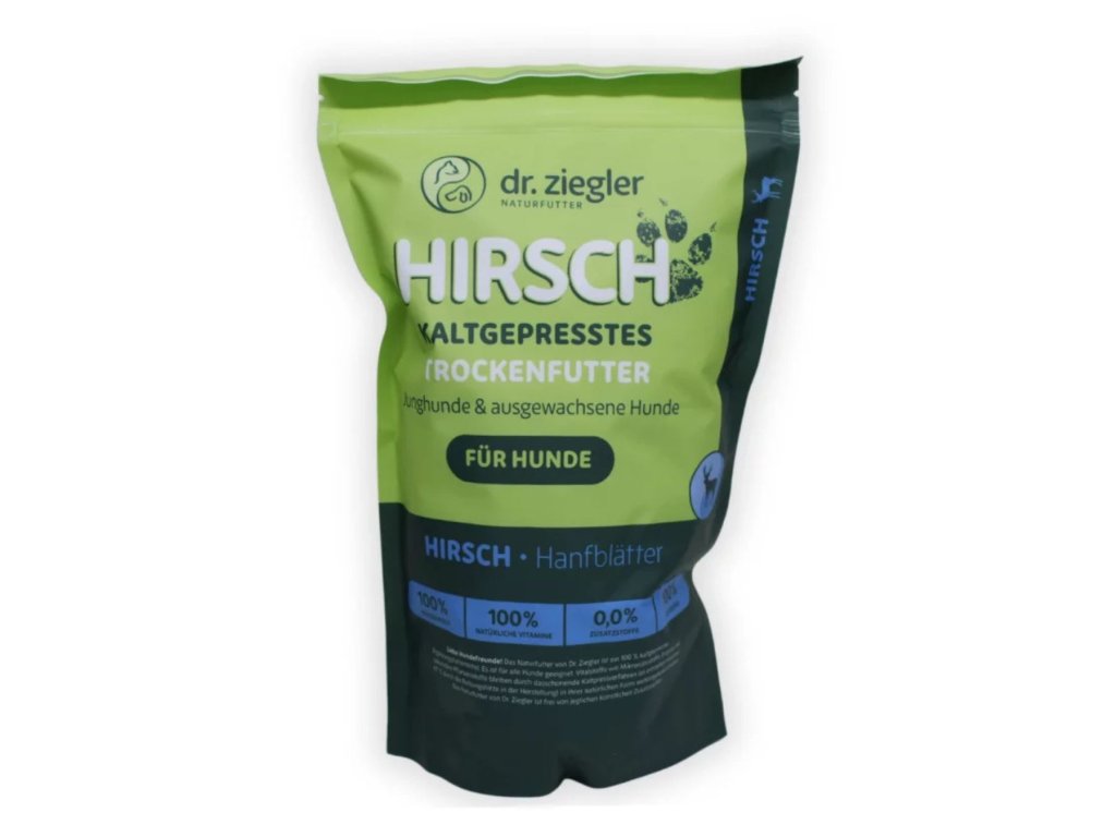 Sušené mleté jelenie mäso 20 %, celozrnná ryža 20 %, hrach, sladký lupina, proso, cvikla, riasy, konopné listy 2 %, rybí olej, ľanové semienko, čierne ríbezle, feniklové semienko, rašelina